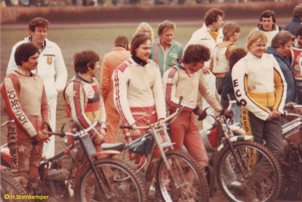 Mit dabei H.J.Labudda, Phil Collins, Shawn Moran, Peter Collins, Hans Nielsen und Günter Bünning. Hinten der Norweger Daghin Dahl.